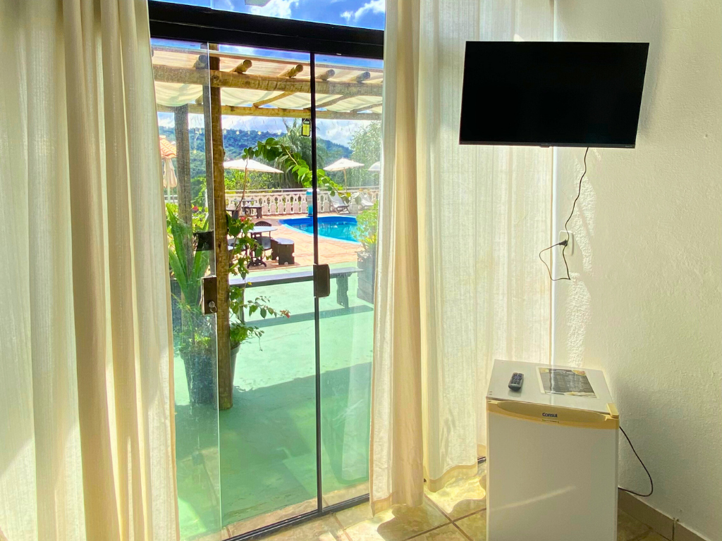 - Café da manhã gratuito, Cama casal padrão, TV Smart, Frigobar, Ventilador, Varanda, Vista da Mata, Banheiro